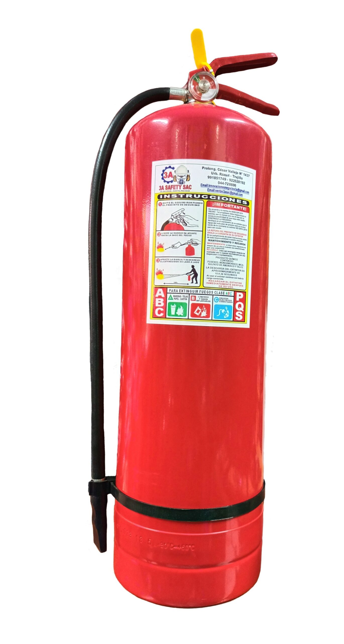 Este extintor cuenta con un bloqueo de seguridad para evitar activaciones accidentales y está diseñado para soportar temperaturas de hasta 60 °C. Su material de polvo químico seco lo hace efectivo para combatir una amplia variedad de incendios, incluyendo aquellos que involucran madera, pintura, textil y materiales multiusos.