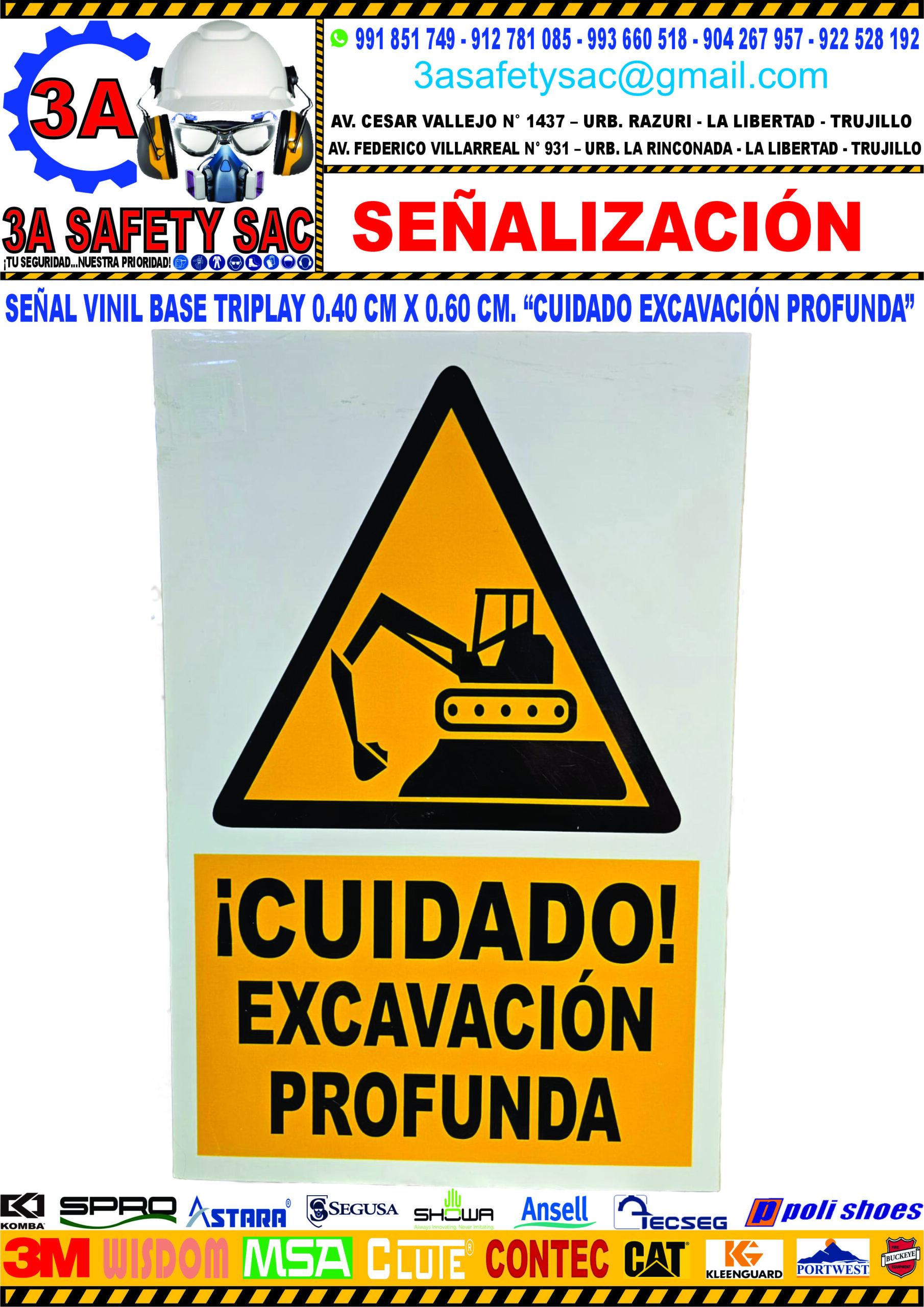 Señal de «Cuidado, Excavación Profunda», diseñada para advertir sobre el peligro de excavaciones en el área.