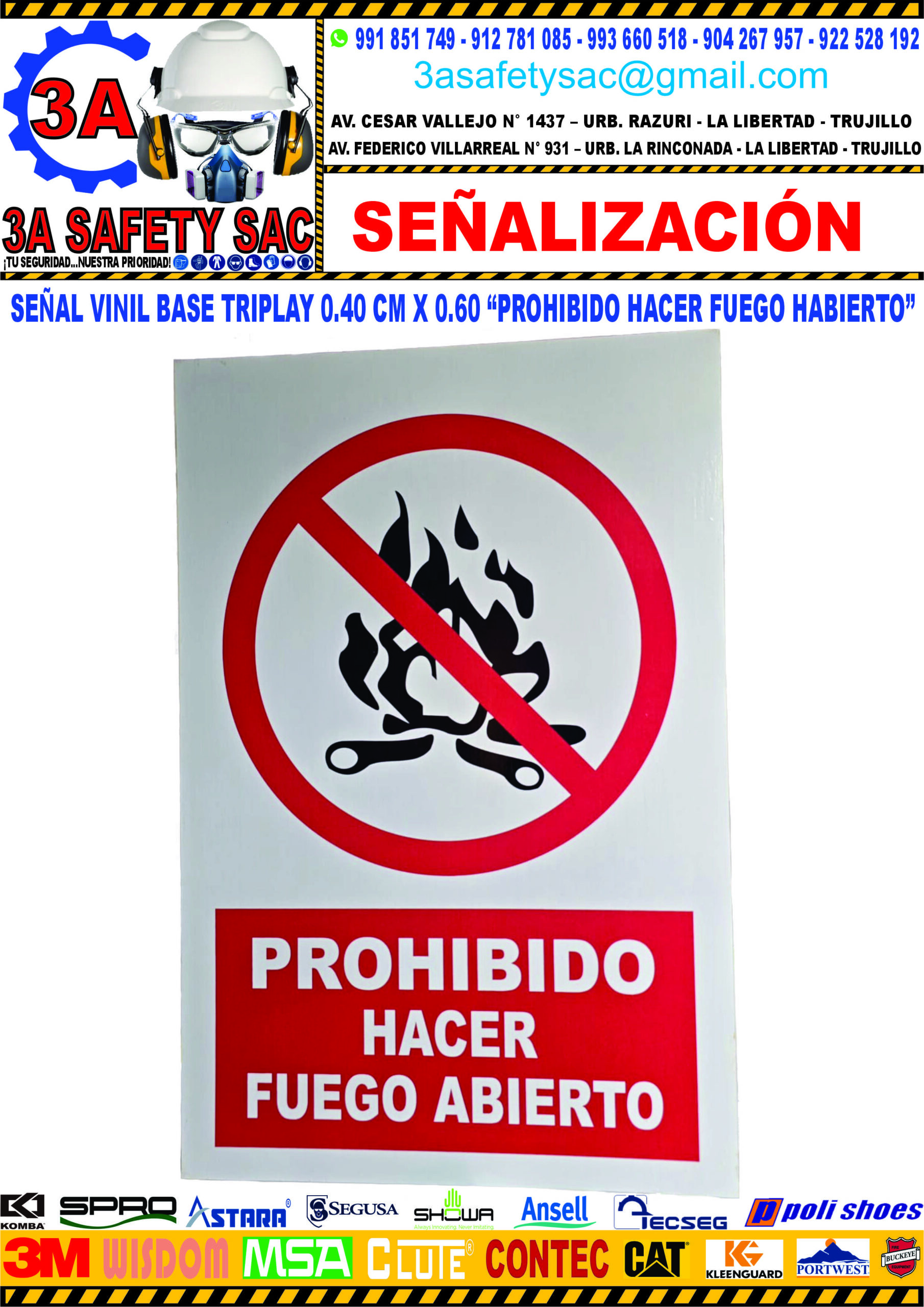 SEÑAL VINIL BASE TRIPLAY 0.40 CM X 0.60 “PROHIBIDO HACER FUEGO HABIERTO”