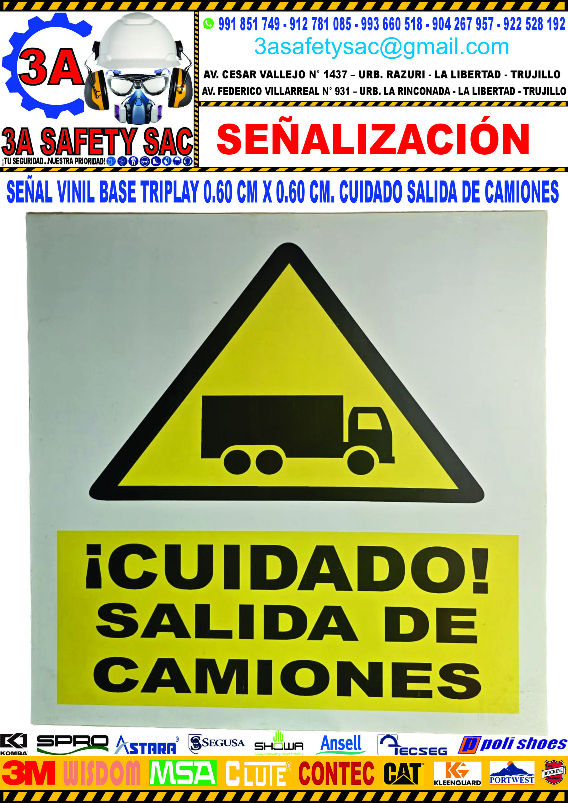 SEÑAL VINIL BASE TRIPLAY 0.60 CM X 0.60 CM. CUIDADO SALIDA DE CAMIONES