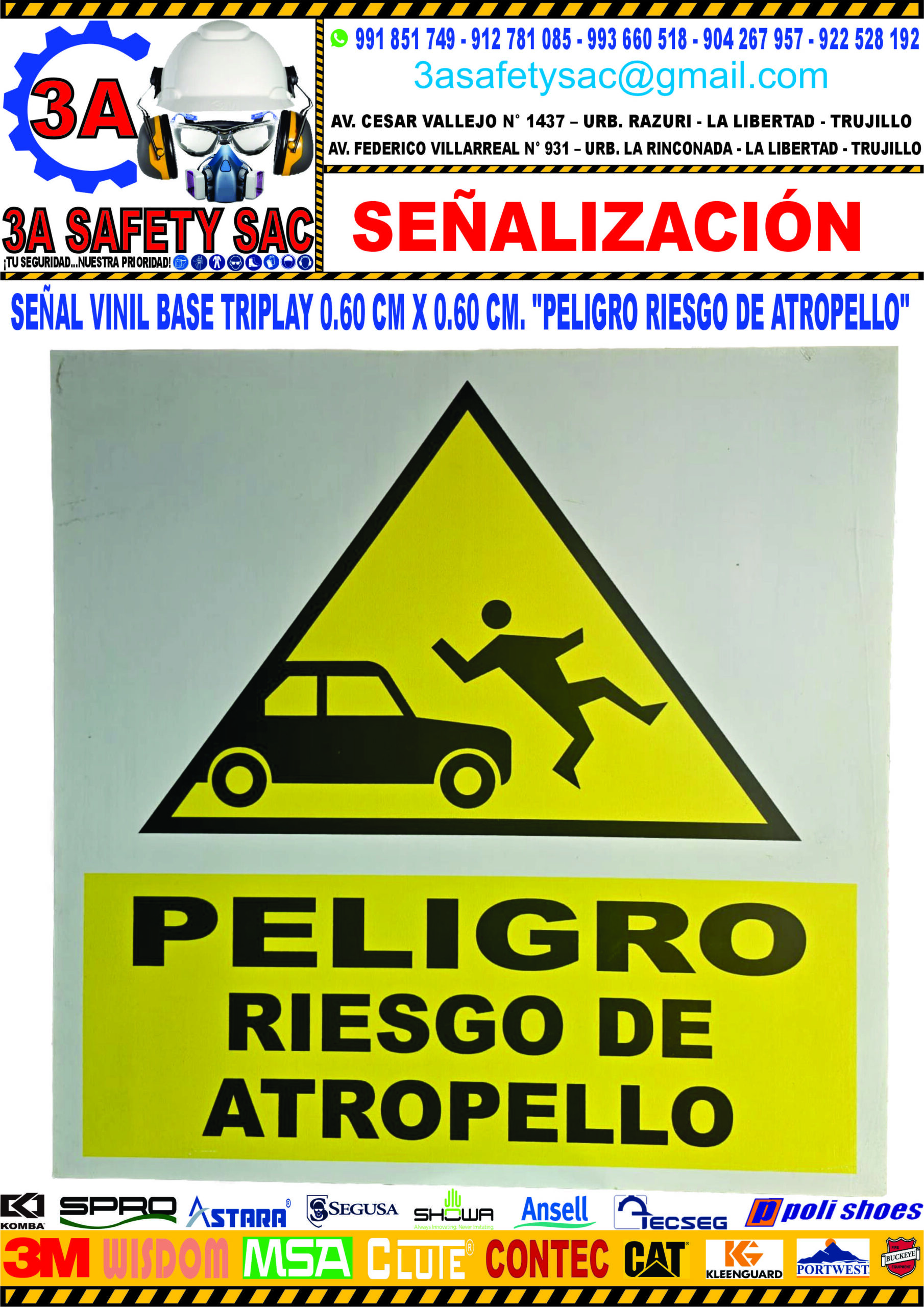 SEÑAL VINIL BASE TRIPLAY 0.60 CM X 0.60 CM. “PELIGRO RIESGO DE ATROPELLO”