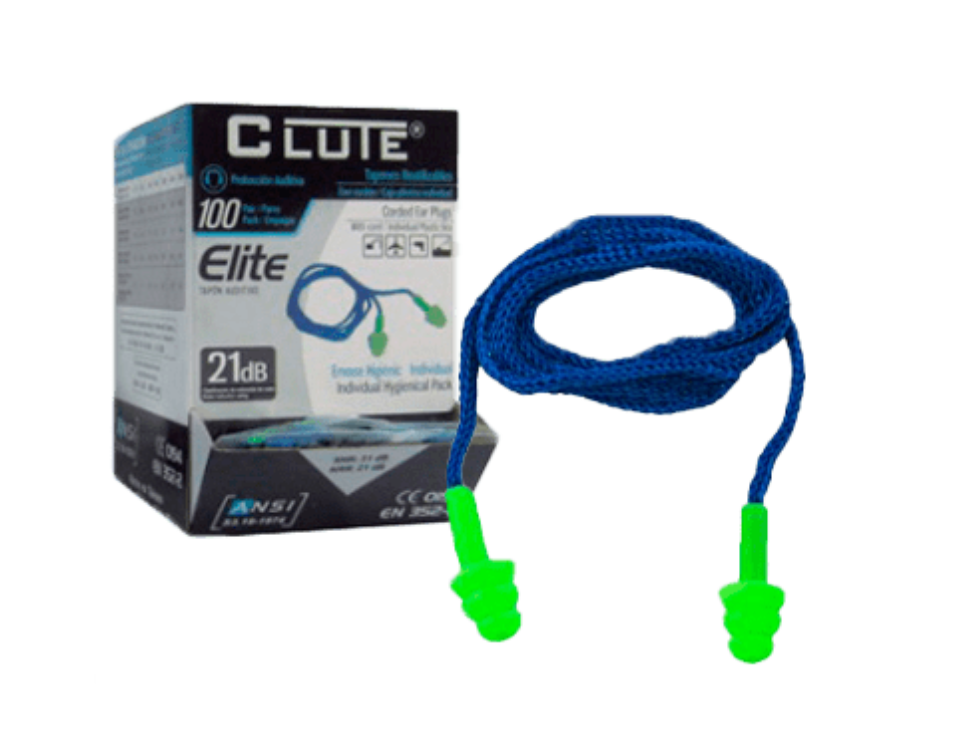 Los tapones auditivos reutilizables de CLUTE, modelo ELITE con cordón, son diseñados para ser insertados en el canal auditivo y ayudar a reducir la exposición de ruido a niveles que no sean dañinos o molestos.